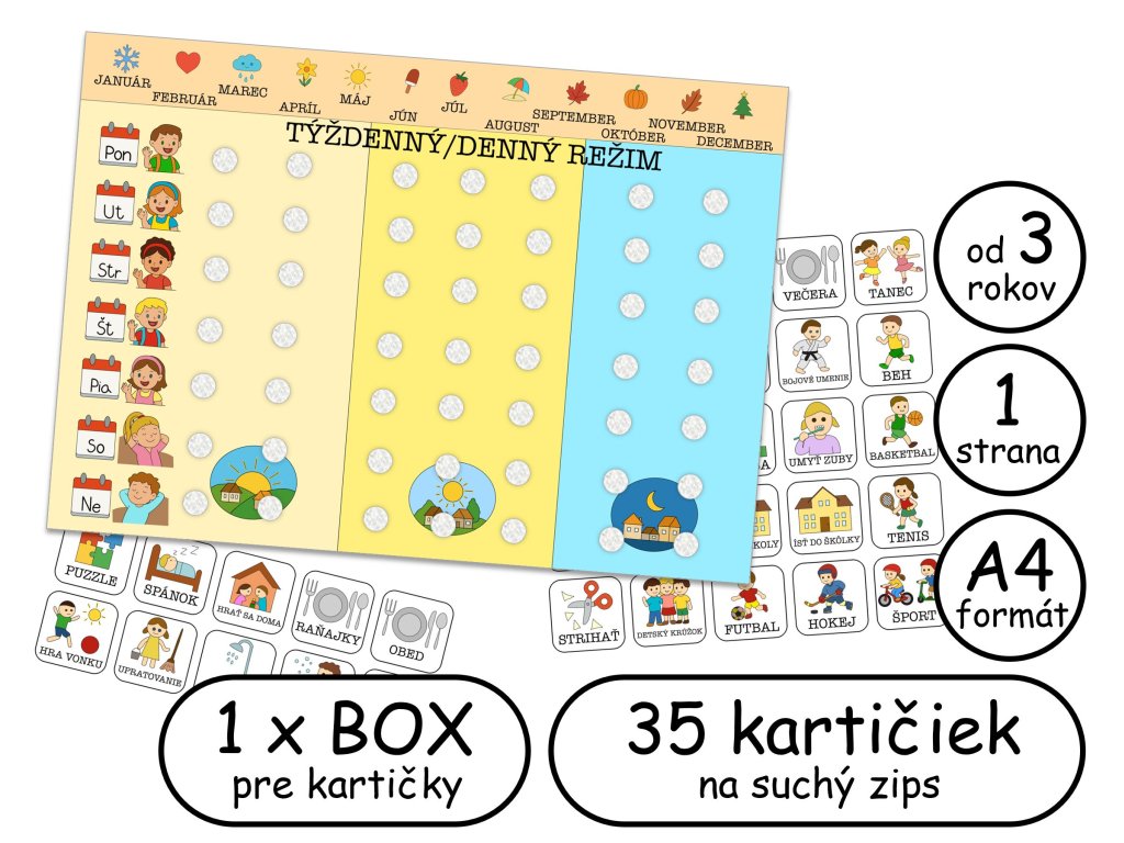 Na karte vo formáte A4 si deti pripevňujú obrázkové kartičky (35 ks) so suchým zipsom a tvoria si vlastný denný alebo týždenný rozvrh. Vďaka možnosti kartičky jednoducho premiestňovať si môžu rozvrh prispôsobovať, meniť a upravovať podľa potreby. Takto sa učia dodržiavať režim zábavnou formou a rozvíjajú svoju samostatnosť.